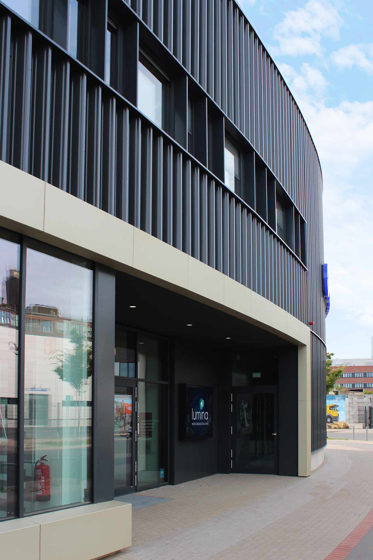 In Anlehnung an den Hauptgüterbahnhof auf der gegenüberliegenden Straßenseite ist die Fassade mit anthrazitfarbenen Trapezprofil ausgeführt worden.