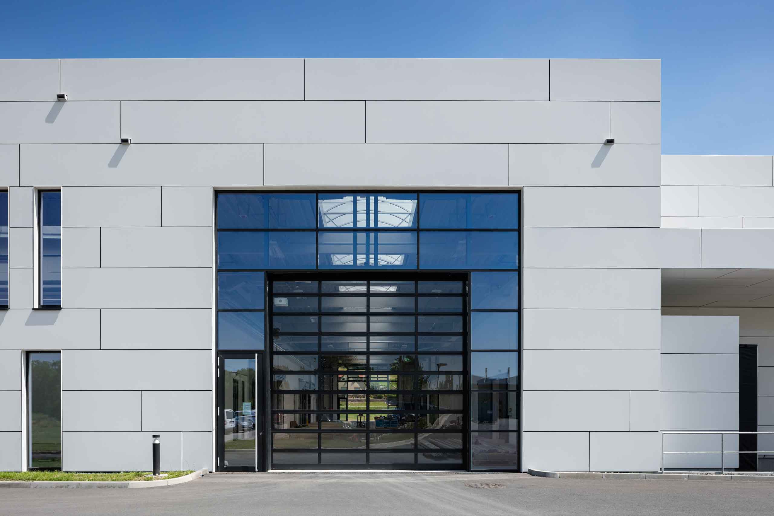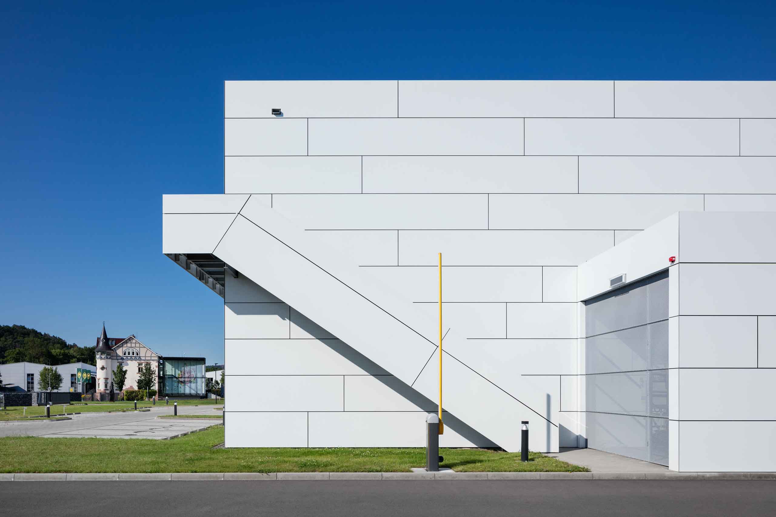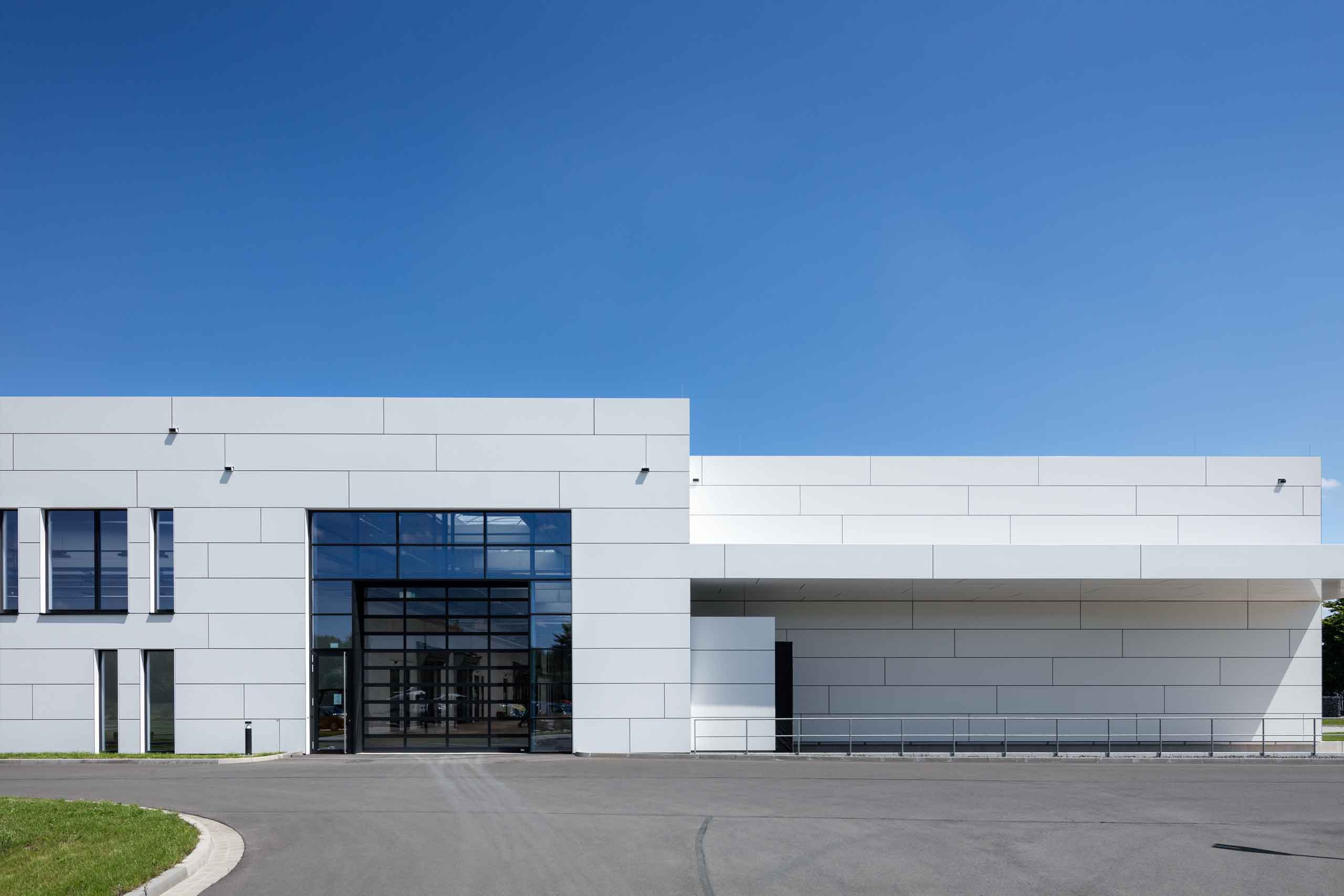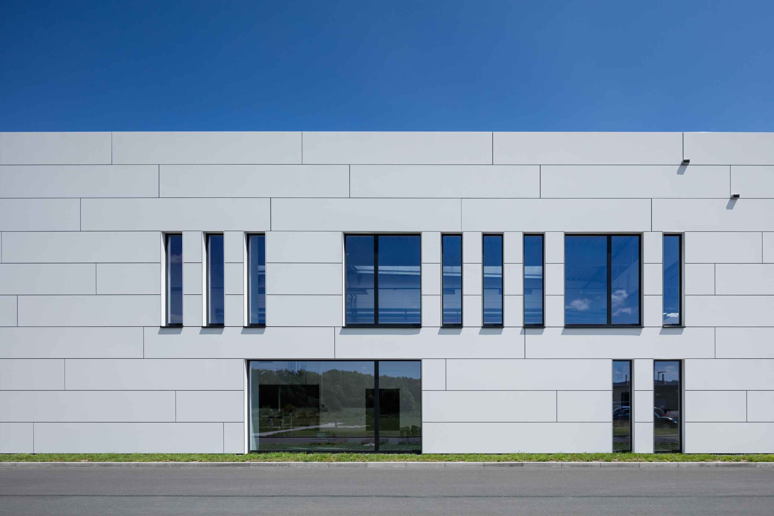 Es bestand ein hoher qualitativer als auch optischer Anspruch an das Projekt, sodass die Halle hochwertig ausgebaut wurde und eine vorgehängte hinterlüftete Aluminiumfassade als Fassadenbekleidung gewählt wurde. Die Fassadenbekleidung wurde im Fassadensystem RoVisio FT der RONGE Gruppe ausgeführt.